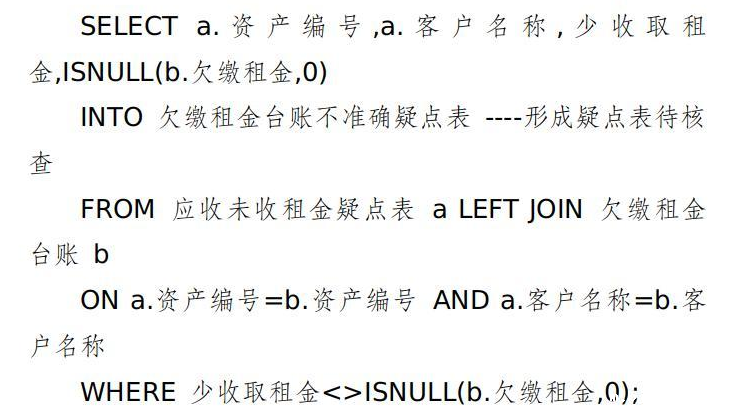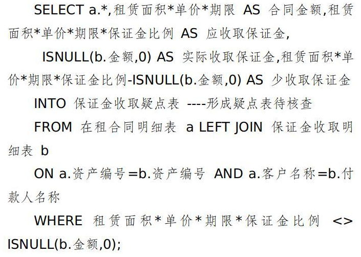 根据在租合同明细表中的租赁面积、单价、期限和相关收取标准,计算出单项合同应收取的保证金金额,与保证金收取明细表中对应资产保证金余额进行比对,若数据不一致,则可能存在多收或少收应收保证金的情况。sql语句如下: