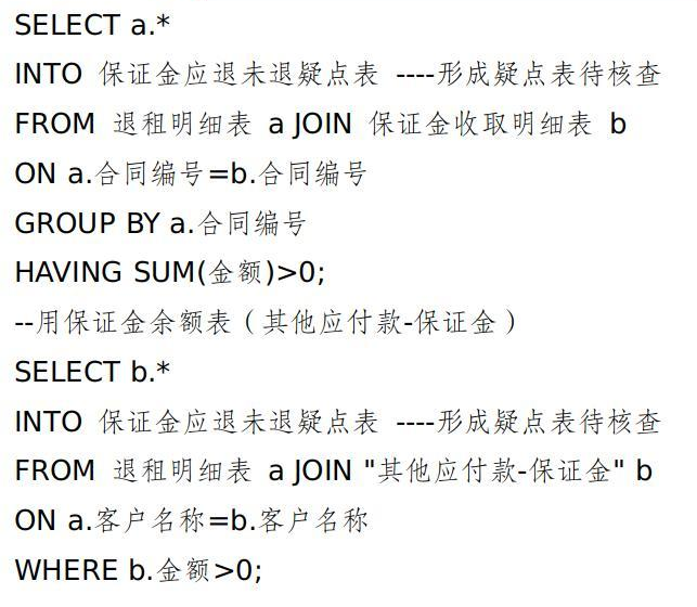 将退租明细表与保证金收取明细表按合同编号进行比对,若退租合同仍存在保证金余额的情况,则可能存在退租和租赁保证金未及时进行清理和退还的情况。sql语句如下: