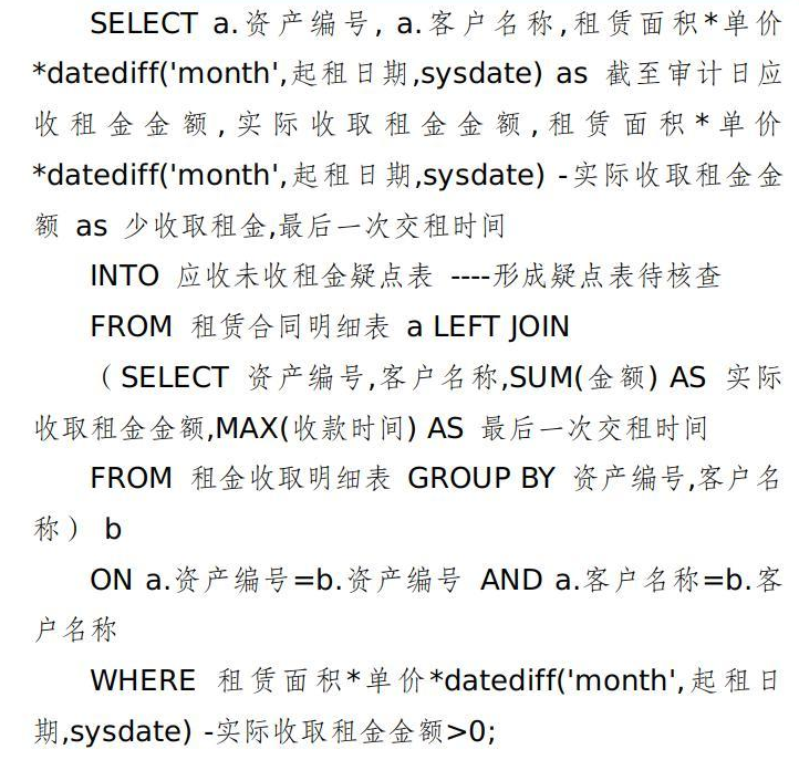 在合同明细表中,将相关信息按合同到期时间进行降序排列,运用vlookup函数,在资产卡片明细表中按资产编号匹配合同明细表中对应资产租赁合同的最后一次到期日,若匹配的日期为空或合同到期日在审计日前,则该项资产有较大可能处于闲置状态,据此形成审计核查重点。sql语句如下: