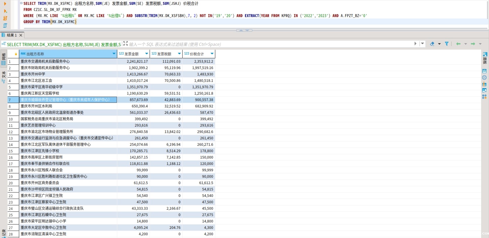 SELECT TRIM(A.DK_XSFMC) 出租方名称,SUM(JE) 发票金额,SUM(SE) 税额,SUM(JSHJ) 价税合计
